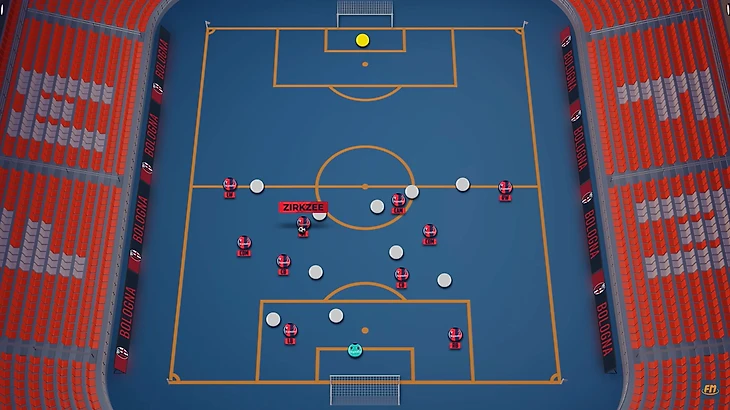 В «Болонье» под руководством Тьяго Мотты розыгрыш мяча от ворот проходил через короткий пас с участием вратаря. При этом остальные игроки совершали много позиционных ротаций. Зиркзе - не исключение. Он опускался, как правило, в правый полуфланг, уводя за собой защитника соперника и создавая пространство для партнеров. Продолжением атаки в большинстве случаев служил сброс мяча на набегающих партнеров.