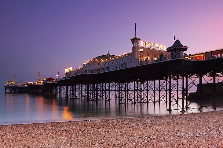 Посмотрите на фото, закройте глаза и пофантазируйте. Слышите шум прибоя и крики чаек? Чувствуете, как аромат сладкой ваты смешивается с соленым и тёрпким запахом моря? Так звучит и пахнет Брайтон, южный город на берегу пролива Ла-Манш. Небольшой рыбацкий посёлок вырос в фешенебельный курорт, когда доктор Ричард Льюис начал прописывать пациентам лечение морской водой в Брайтоне. В конце XIX века город притягивал любителей новых технологий. Здесь запустили новое транспортное средство: что-то среднее между паромом и трамваем. Огромные паукообразные тележки на четырех «лапах» двигались по рельсам, проложенным на дне моря.