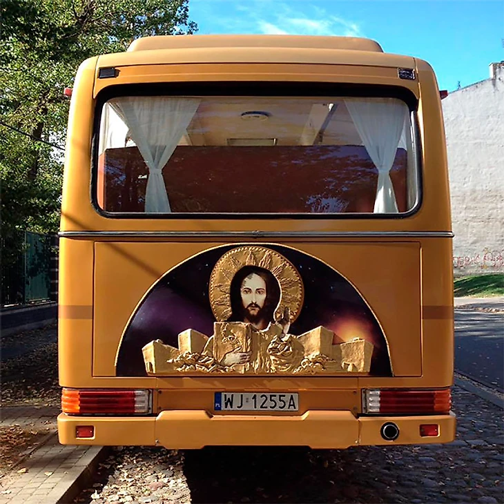 Автобус клубу купил популярный польский актер. Он покрыт золотистыми красками, а на его тыльной стороне изображен лик Христа.