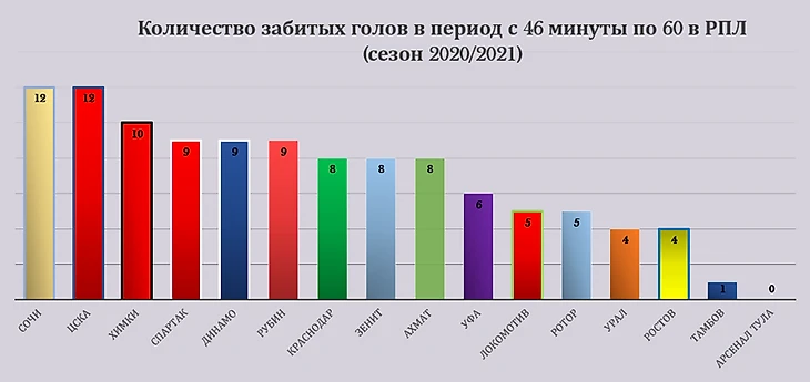 С 46 минуты по 60 минуту – оперативная аналитика. В данный временной промежуток на первый план выходит операционный анализ соперника по ходу матча. Во время первого тайма в режиме лайв готовится материал, который будет использован в перерыве матча. В перерыве тренерский штаб доносит информацию до игроков, тем самым внося корректировки. По данному показателю «Сочи» и «ЦСКА» являются лидерами лиги.