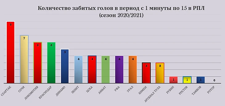 С 1 минуты по 15 минуту — предматчевая аналитика. В данный промежуток времени на первый план выходит тактическая подготовка команды под данного соперника. Исходя из графика ниже, «Сочи» является второй командой в лиге по числу забитых мячей в данный промежуток времени.