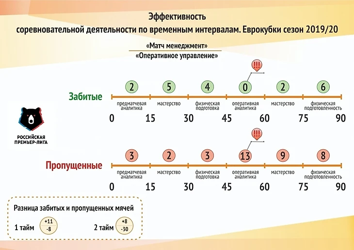 В феврале 2020 года на семинаре «Дела Футбольные» Дмитрий Столбиков — тренер-аналитик футбольного клуба «Урал» — поделился своим исследованием относительно эффективности соревновательной деятельности по временным интервалам.