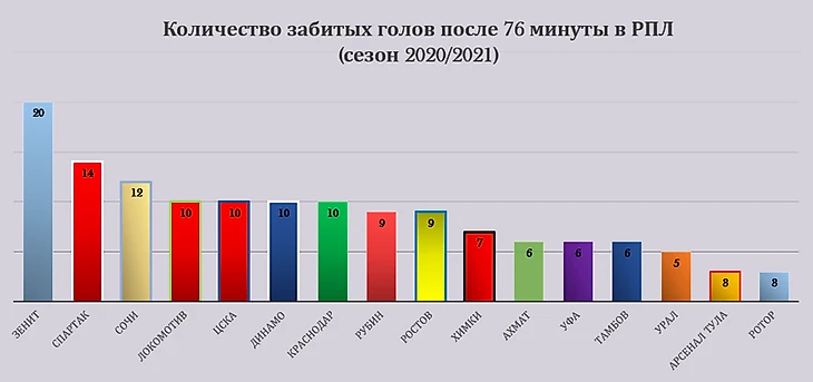 По итогам сезона Тинькофф РПЛ «барсы» являются третьей командой по количеству мячей, забитых в последней 15-ти минутке. При этом стоит отметить, что в шести матчах голы после 76 минуты являлись переломными, благодаря которым «Сочи» добрали 14 очков (расчёт очков производился от счёта к 75 минуте матча; если к 75 минуте была ничья, а в итоге выиграли — +2 очка; если к 75 минуте проигрывали и выиграли — +3 очка; если проигрывали и свели к ничьей — +1; если к 75 минуте уже вели в счете и упрочили преимущество, то такие матчи в подсчёт очков не входили — прим.).