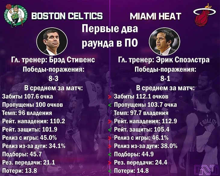 -) В свою очередь, проблем у Хит с лидерством или характером, кои были у Торонто, сейчас нет даже и близко, что в первую очередь доказывается игровой дисциплиной команды: возможность к «комбэкам», достаточно ровные матчи, без разных по качеству игровых отрезков.