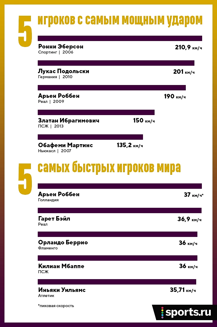 Только Роббен попадает в топ самых скоростных игроков планеты – и не просто попадает, а возглавляет его. На ЧМ-2014 он включил режим Усэйна Болта, со своей половины рванул мимо Серхио Рамоса и помог Голландии добить испанцев пятым голом. В той атаке Роббен разогнался до немыслимых 37 км/ч.
