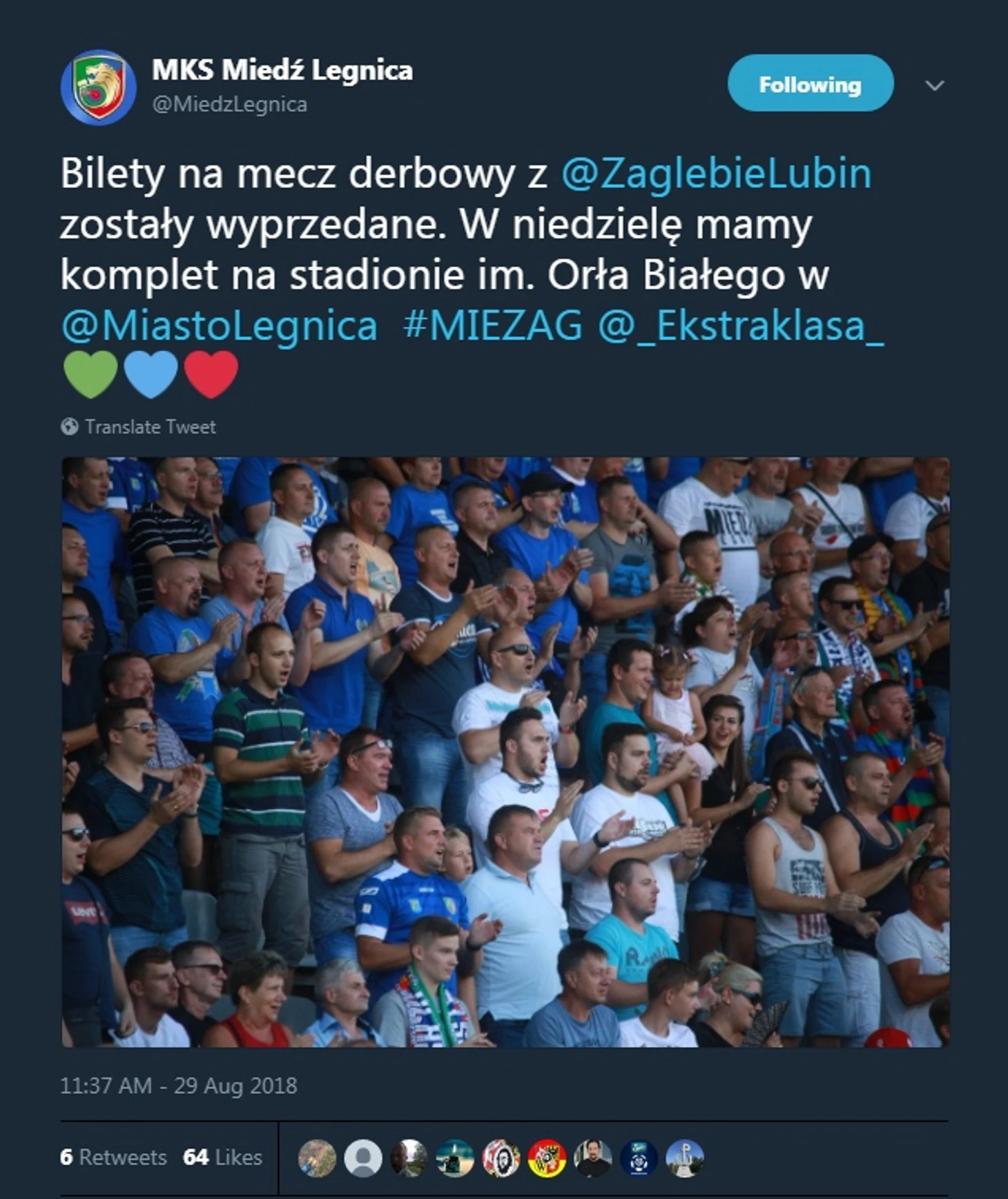 Эта встреча станет первой игрой между командами в рамках Экстракласы. Болельщики обоих клубов готовятся к этому противостоянию, даже похлеще чем сами игроки. В среду «Медзь» объявила в своем твиттере, что билетов на матч в продаже уже не осталось, в воскресенье будет аншлаг, хотя могло ли быть иначе...