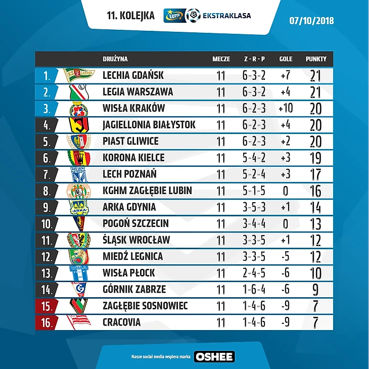 «Лехия» сбавила ход в последних турах и потеряла лидерство в таблице. «Заглембе» из Сосновца выглядел как раз тем соперником, в матче с которым гданьчане могли вернуться на победную тропу. Во всех матчах 11-го тура первый мяч залетал в ворота довольно быстро. Не стал исключением и матч в Гданьске. Уже на 8-ой минуте Липски с метров шестнадцати открыл счет. Развить преимущество у хозяев не получилось, более того гости сумели сравнять цифры на табло усилиями Саного, который воспользовался передачей Вжесиньского. Одним из открытий нынешнего сезона стал Лукас Хараслин, который сильно добавил в этом сезоне. Очередной его слаломный проход по флангу завершился передачей на Кубицкого, который с нескольких метров расстрелял ворота «Заглембе». Во втором тайме «лехисты» смогли еще дважды поразить ворота «Заглембе». Сначала Хараслин заработал пенальти, который реализовал Пайшау, а на 63-ей минуте Липски из сегмента пробил в дальний угол, оформив дубль. «Бело-зеленые» побеждают после трёхматчевой серии без побед и возвращаются на первую строчку, как минимум до красно-желтого дерби в воскресенье. Днем в понедельник было объявлено, что Дариуш Дудек подал в отставку с поста главного тренера команды, руководство «Заглембе» отставку приняло.