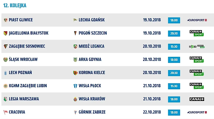 Открывался 11-ый тур в Легнице, куда пожаловал один из лидеров чемпионата «Пяст». Хозяева оказались не очень гостеприимными. Уже на 5-ой минуте Шчепаньяк воспользовался ошибкой обороны «красно-синих» и открыл счет. Подопечные Форналика быстро пришли в себя. Уже на 18-ой минуте чешский легионер гостей Пападопулос головой замкнул подачу с левого фланга - Сапела даже не пытался вытащить этот удар. А под занавес первой половины встречи на табло уже горели цифры в пользу гливичан. Снова подача с левого фланга привела к голу, но на этот раз грубую ошибку допустил Сапела, из-за чего мяч попал в Пикка, от которого и залетел в ворота. На этом первый тайм не закончился. Уже в добавленное время Пьясецки с близкого расстояния расстрелял Шматулу. Во втором тайме уже не было такого количества опасных моментов, команды старались вырвать победу, но ни хозяевам, ни гостям забить больше не удалось. «Медзянка» и «Пяст» делят очки, как кажется, на победу никто из них не наиграл.