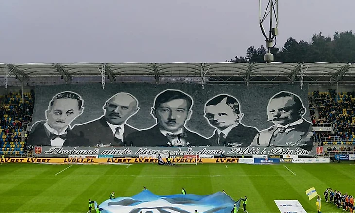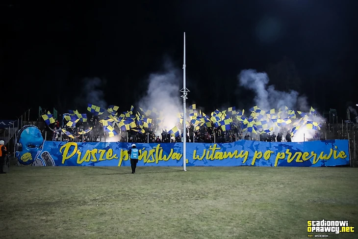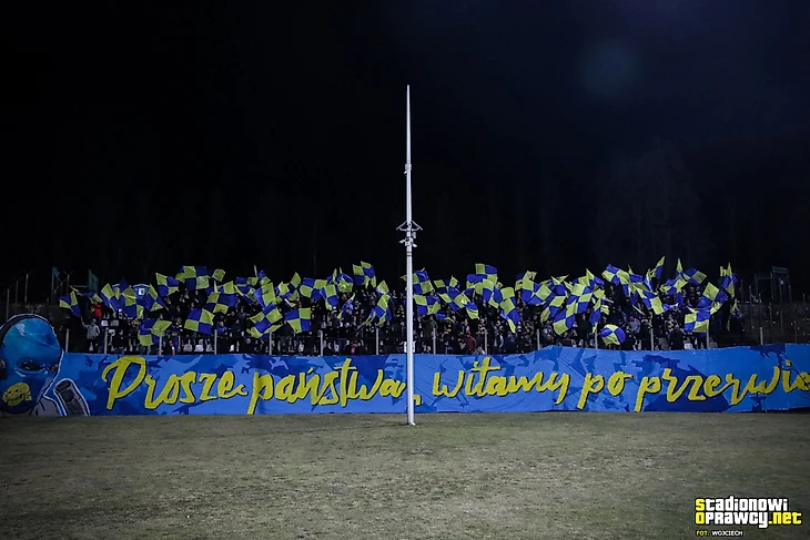 «Арка» наконец-то после долгих банов на выезды появилась в Сосновце. Это событие гдыняне отметили оправой "Дорогие дамы и господа, приветствуем вас после перерыва".