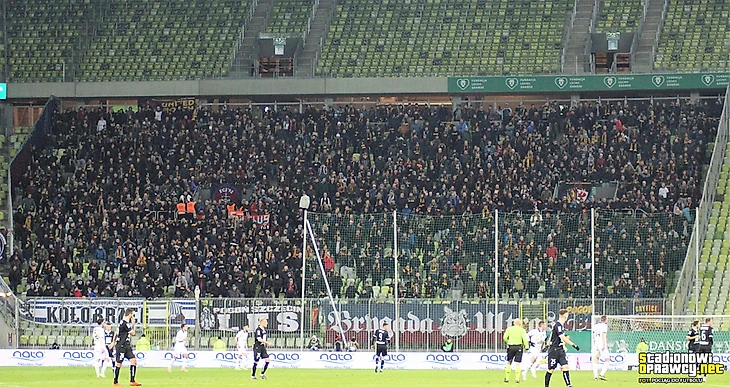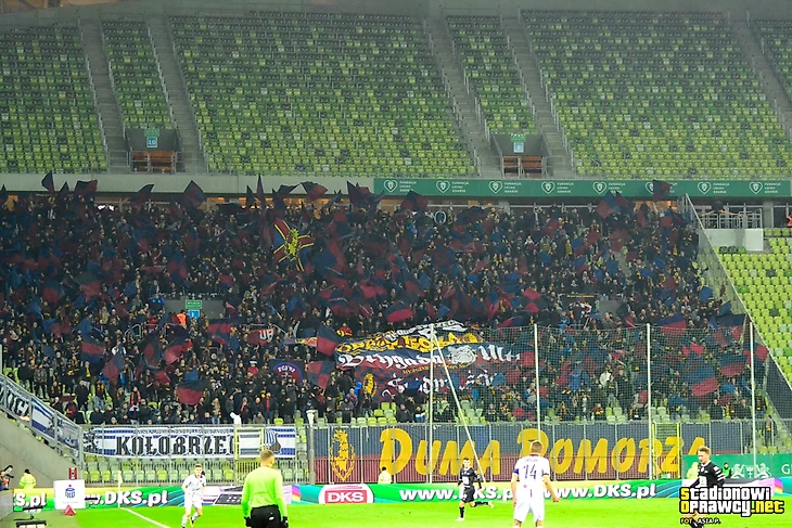 Щецинцев в Гданьск выбралось чуть меньше двух тысяч, они полностью заполнили гостевой сектор, а во втором тайме зажгли несколько единиц пиротехники.