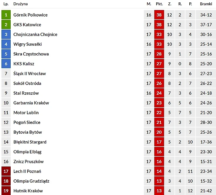 На второе место неожиданно поднялся дебютант І лиги из Ленчны. Пока «Термалика» сражалась с «ЛКС» за лидерство «черно-зеленые» стабильно набирали очки. Сильной стороной «Гурника» была оборона, 32-летний Мацей Гостомски пропустил всего 12 мячей за первую часть сезона, это второй результат в лиге, меньше пропустил только лидер. После повышения в классе «Гурник» не стал сильно менять состав, сделав ставку на игроков, которые добывали путевку во второй дивизион. Как показали первые 17 туров, эта ставка была оправдана. «Гурник» явно превосходит все ожидания, которые выписывались команде перед стартом чемпионата, но остаться в зоне прямого повышения будет сложно. Спрогнозирую, что клуб из Ленчны чуть сбавит ход во второй части сезона и опустится в зону плей-офф.