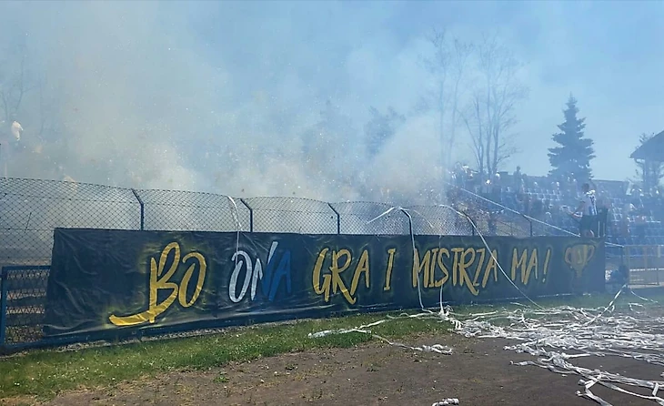 Снова пятый дивизион. Фанаты «Гурника» Валбжих на матч с «Влукняжем» подготовили баннер «Потому что она играет и имеет чемпионство», к которому была зажжена пиротехника.