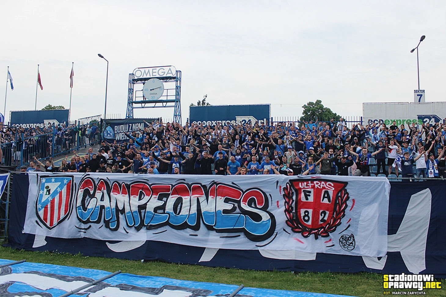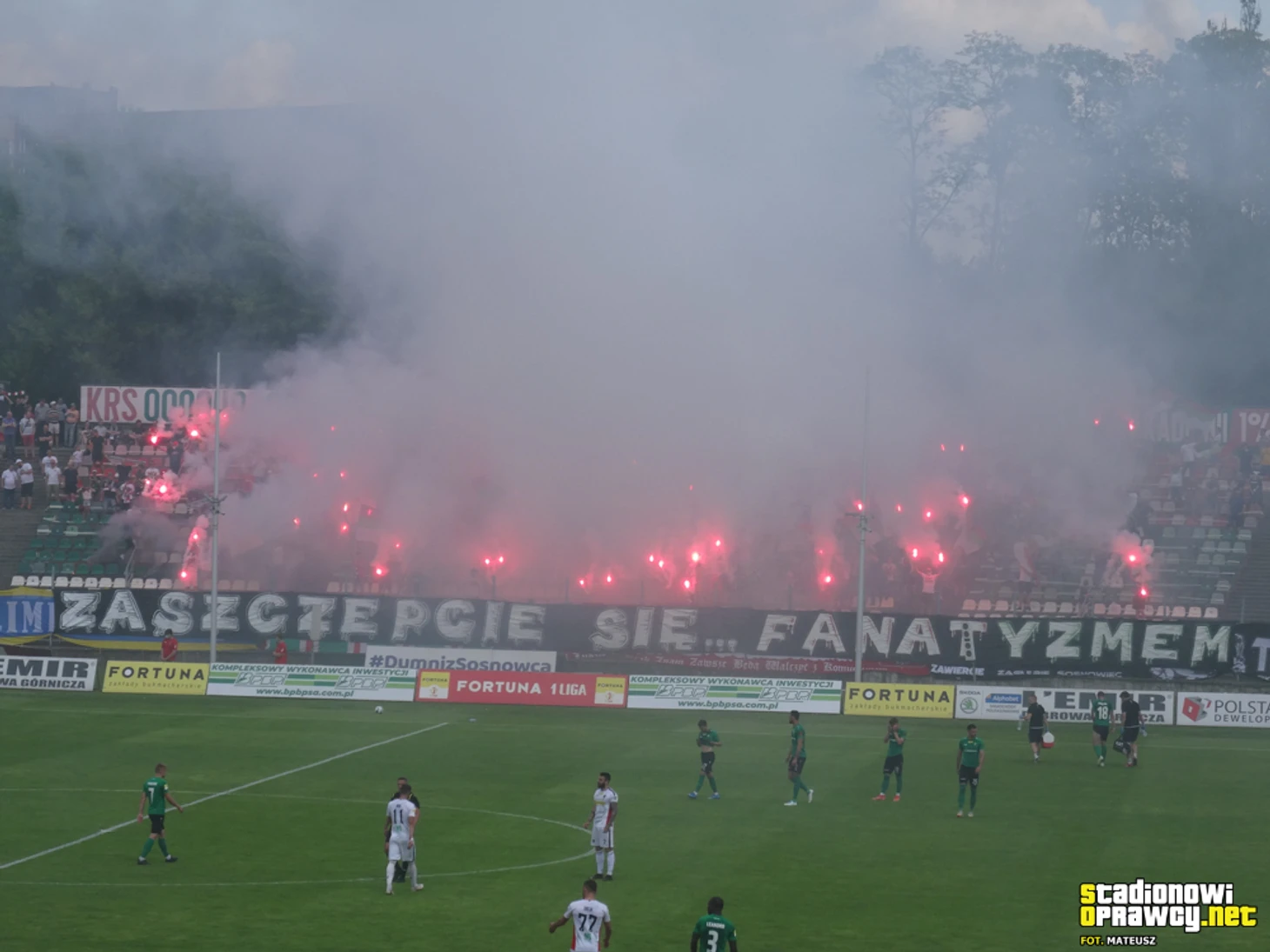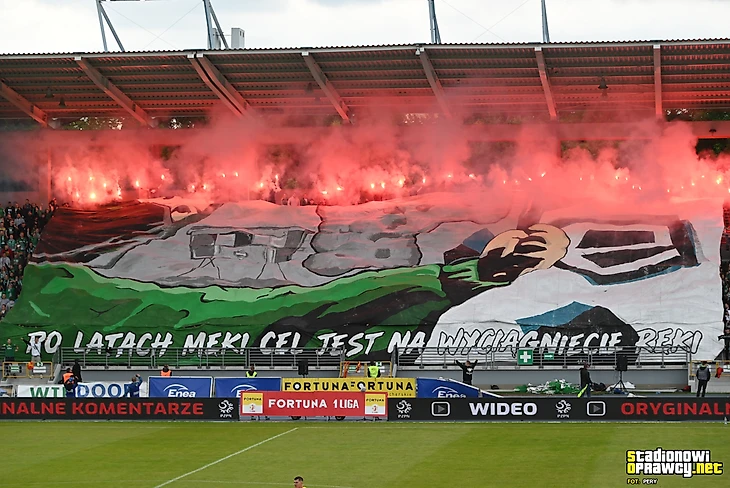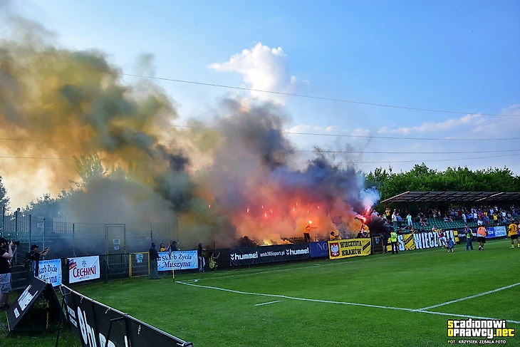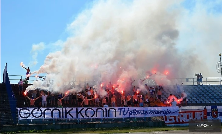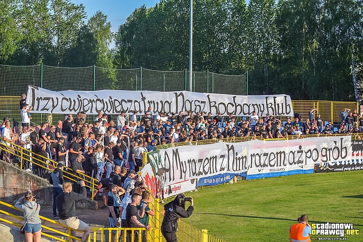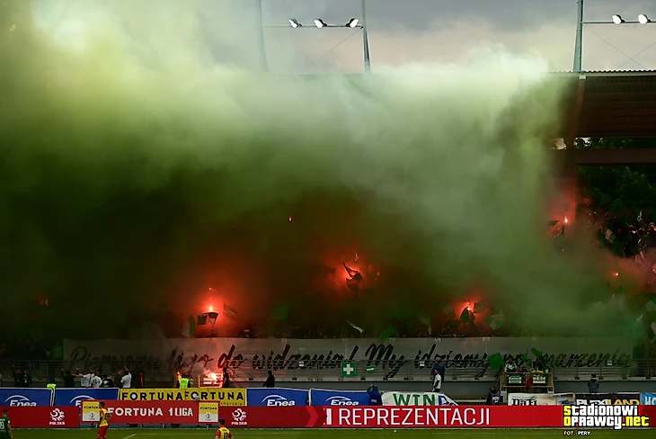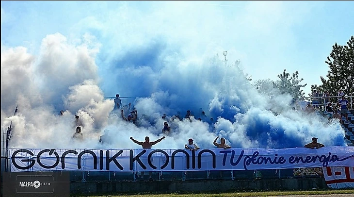 «Гурник» Конин на матче с «Мешко» прощался с центральным уровнем футбольной пирамиды Польши. По итогам сезоне «Гурник» вылетает в пятый дивизион. Фанаты конинцев продемонстрировали оправу «Гурник Конин ТВ горит энергия».