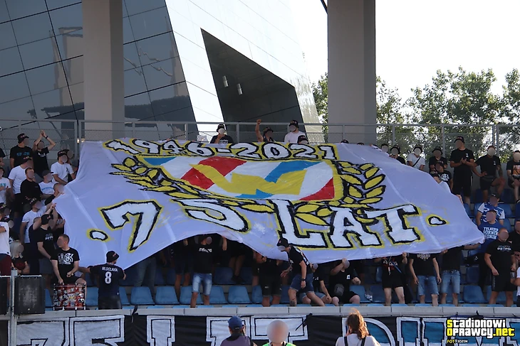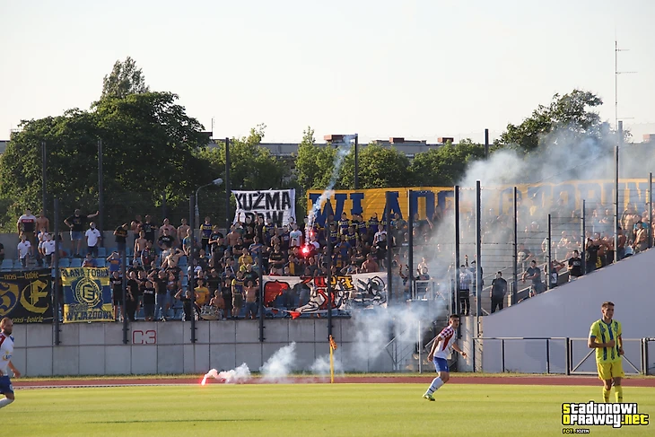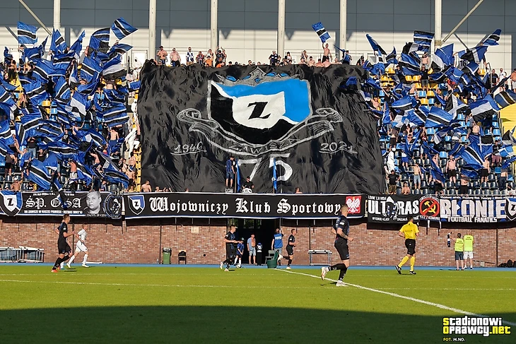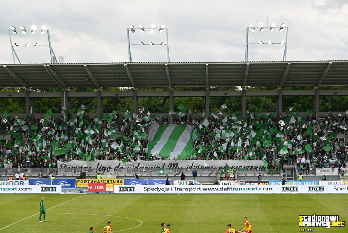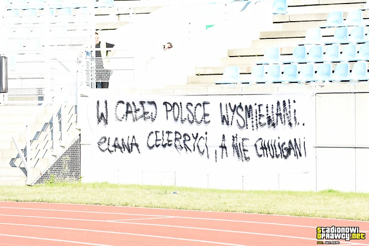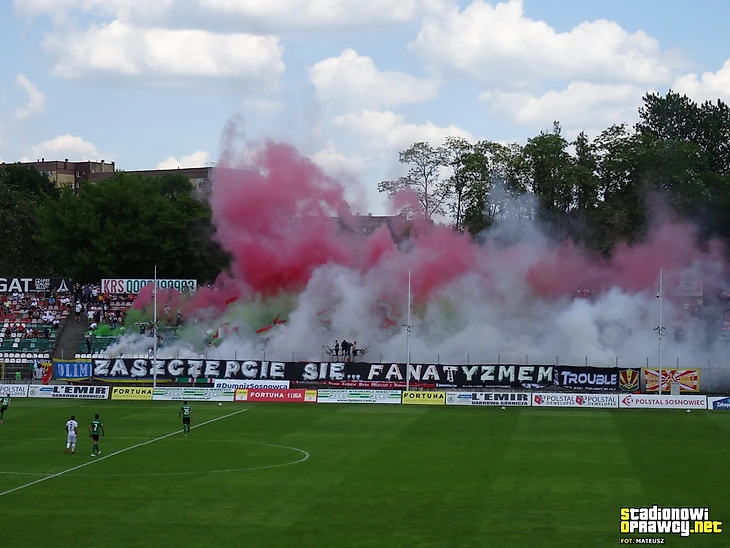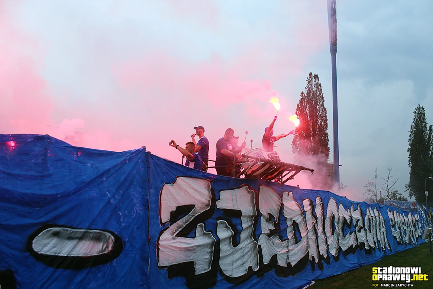 «Гурник» Конин на матче с «Мешко» прощался с центральным уровнем футбольной пирамиды Польши. По итогам сезоне «Гурник» вылетает в пятый дивизион. Фанаты конинцев продемонстрировали оправу «Гурник Конин ТВ горит энергия».