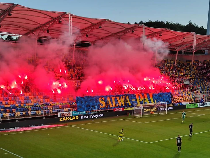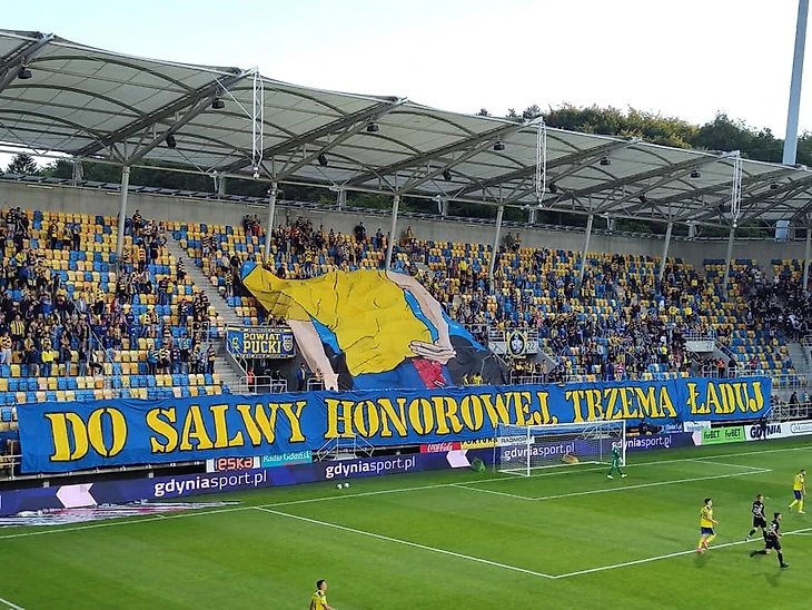 16-го июня «Арка» принимала «ЛКС» в матче плей-офф за путёвку в Экстракласу. Фанаты хозяев подготовили оправу, состоящую из двух частей «К почетному залпу, тремя заряжай» и «Залп-огонь». Такая поддержка гдынянам не помогла, и они минимально проиграли 0:1.