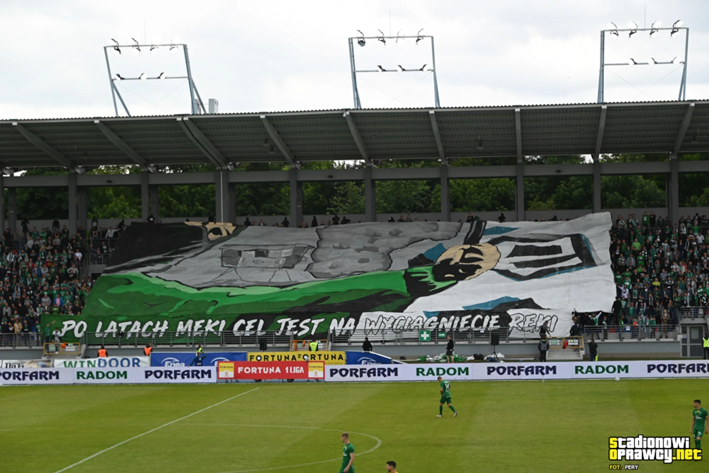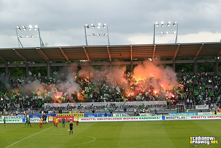 13-го июня прошёл последний тур I-ой лиги. «Радомяку», чтобы выйти в Экстракласу, достаточно было не проиграть «Короне». Фанаты хозяев подготовили сразу две оправы, посвященные выходу в элиту. Интересно, что бы они делали, если бы их любимцы уступили в решающей встрече.