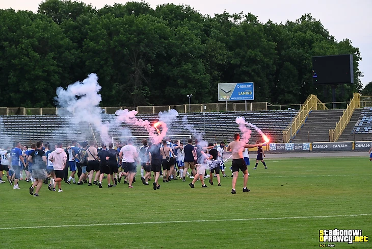 «ГКС» Катовице обеспечил себе выход в I-ую лигу в предпоследнем туре третьего дивизиона, а после последнего матча сезона в Оструде фанаты дождались своих любимцев в Катовице и ярко отметили успешное окончание сезона.