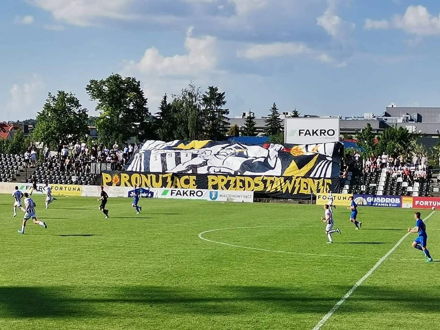 На матч I-ой лиги против «Пущи» фанаты «Сандецьи» подготовили оправу из баннера и секторувки «Зажигательное представление».