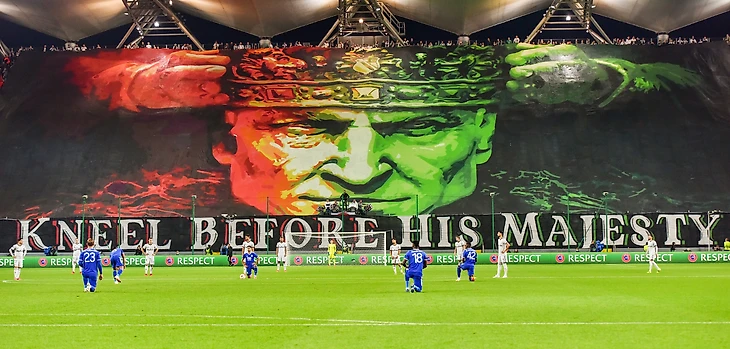 Куда же без «Легии». 30-го сентября варшавяне на матче с «Лестером» подготовили оправу "Преклони колено перед его величеством". Буквально через минуту англичане действительно стали на колено, в очередной раз поддержав BLM. Суперперформанс. Браво!