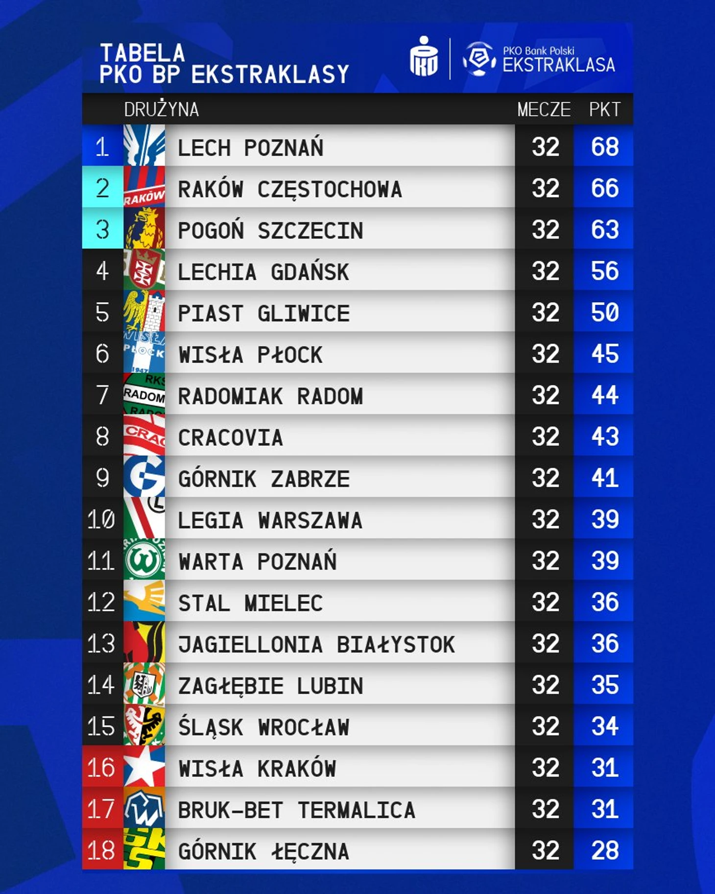 В 32-ом туре произошло, возможно, ключевое событие в борьбе за чемпионство. «Ракув» не смог обыграть «Краковию» и позволил «Леху» единолично возглавить турнирную таблицу за два тура до конца. А вот в борьбе за выживание пока ничего не прояснилось - «Висла» продолжает разбазаривать очки и постепенно приближается к I-ой лиге.