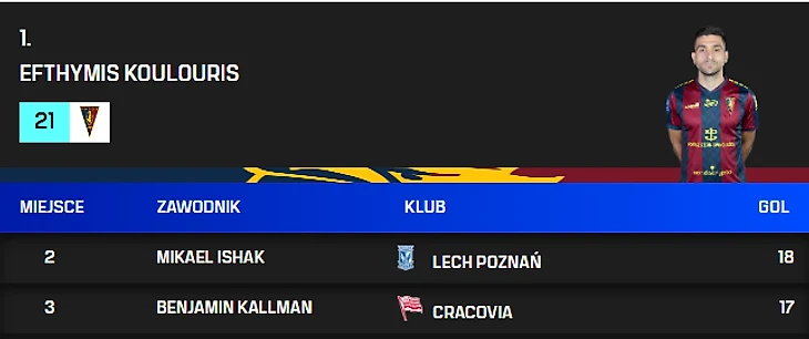 Сохраняется интрига и в бомбардирской гонке. Там за пять туров до конца с преимуществом в три мяча лидирует Эфтимис Кулурис, форвард «Погони», но капитан «Леха» Ишак и форвард «Краковии» Кальман не собираются легко сдаваться.