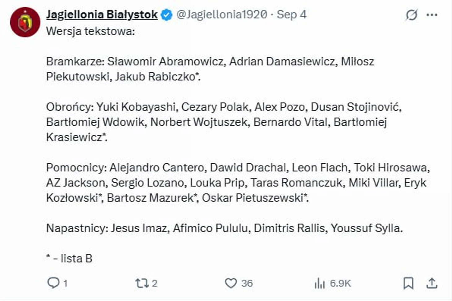 По аналогичной причине в заявку не попал Камиль Южвяк, но на флангах полузащиты у Семенеца выбор куда больше, из-за отсутствия экс-игрока «Леха» в Белостока вряд ли кто-то будет переживать.