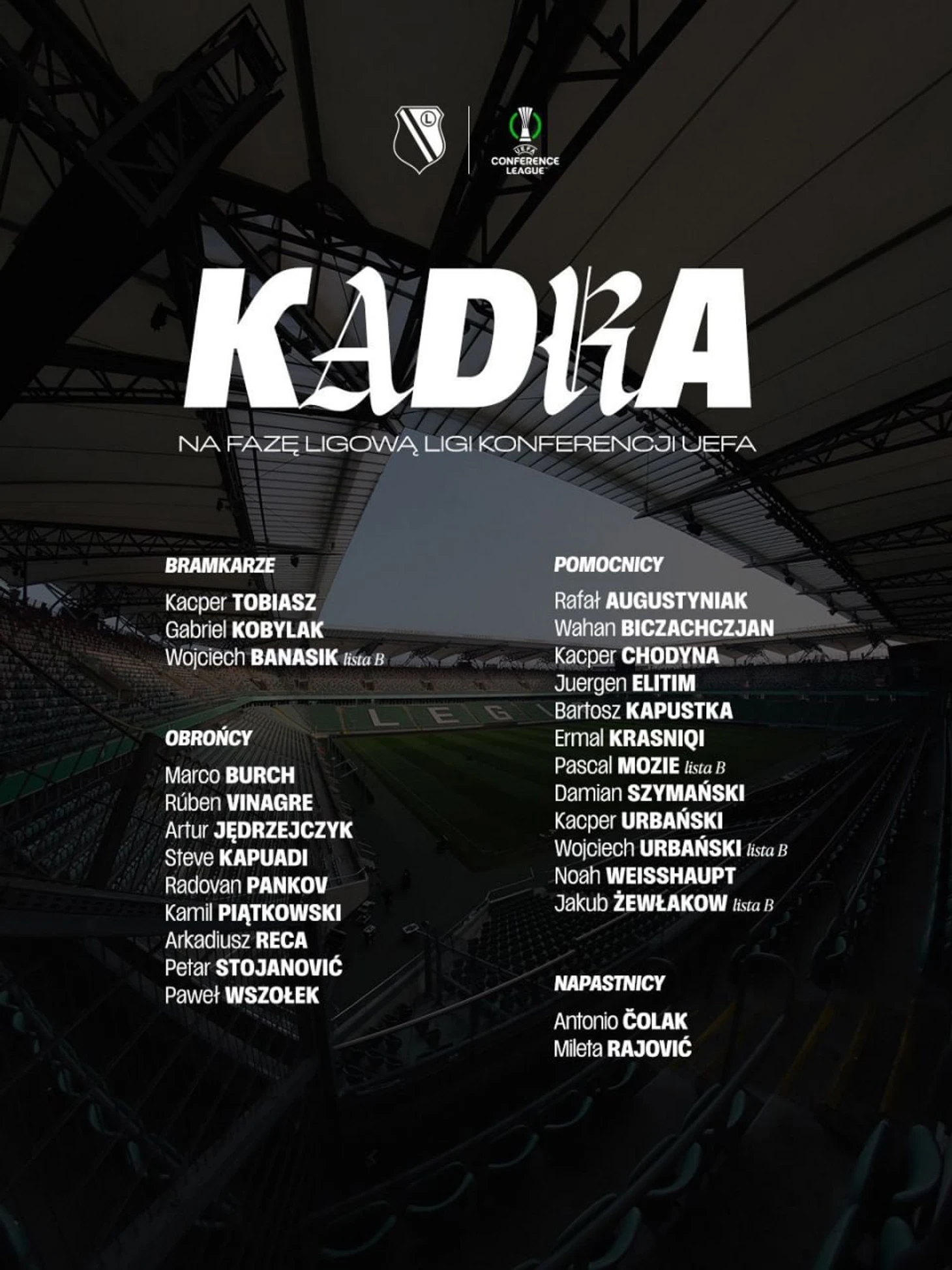Всех новичков «Легия» успела подписать до регистрационного дедлайна, но не все новички попали в эту самую заявку. Не нашлось места здесь 20-летнего португальцу Энрике Аррейолу, а также опытному полузащитнику Клоду Гонсалвешу. Из-за повреждения до конца года выбыл Жан-Пьер Нсаме, один из героев еврокубковой квалификации (5 голов в 7 матчах), поэтому опытного камерунца тоже нет в заявке «Легии».