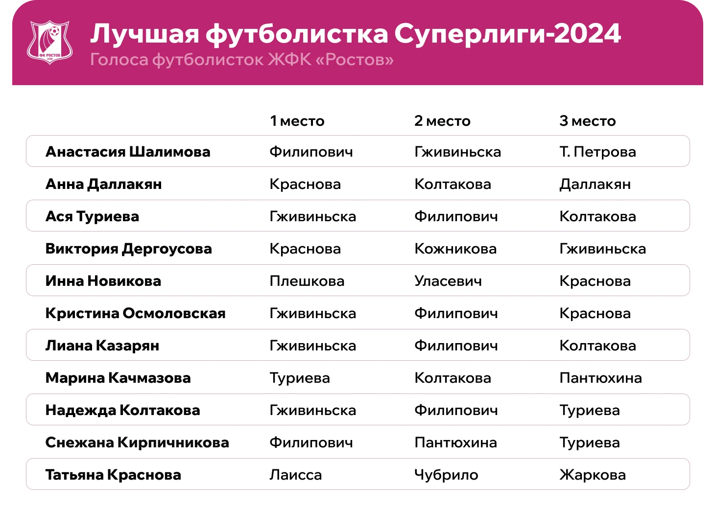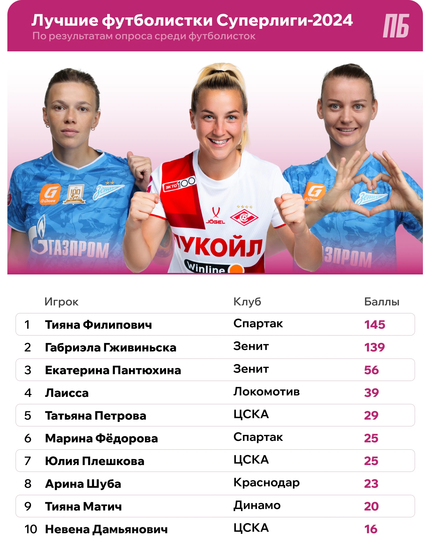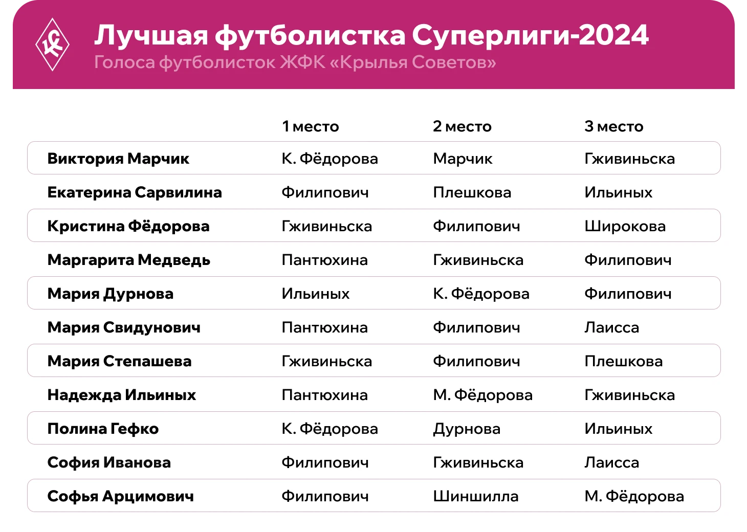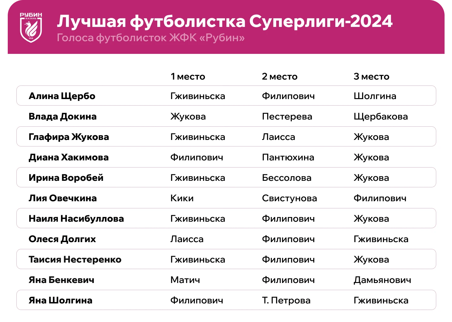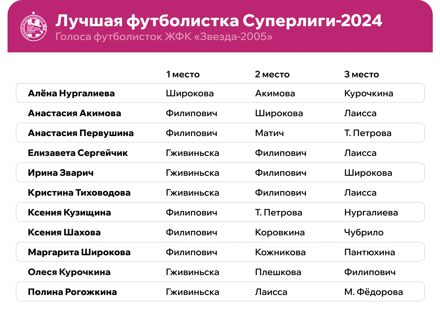 Лидерами голосования внутри многих команд стали местные игроки: Габриэла Гживиньска в «Зените», Арина Шуба в «Краснодаре», Марина Федорова в «Спартаке».