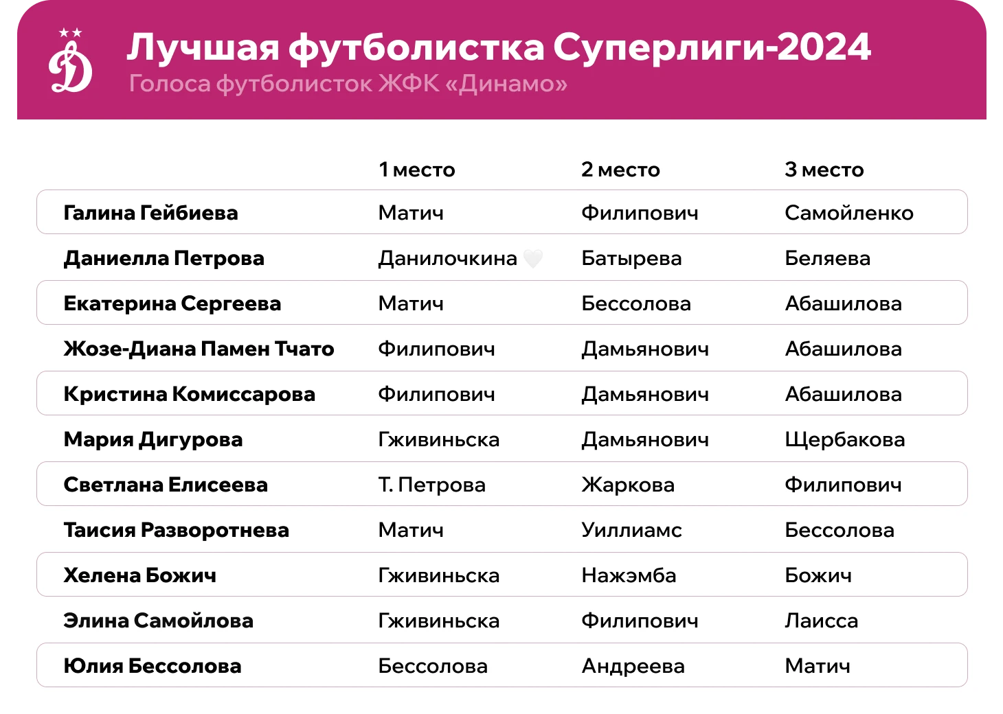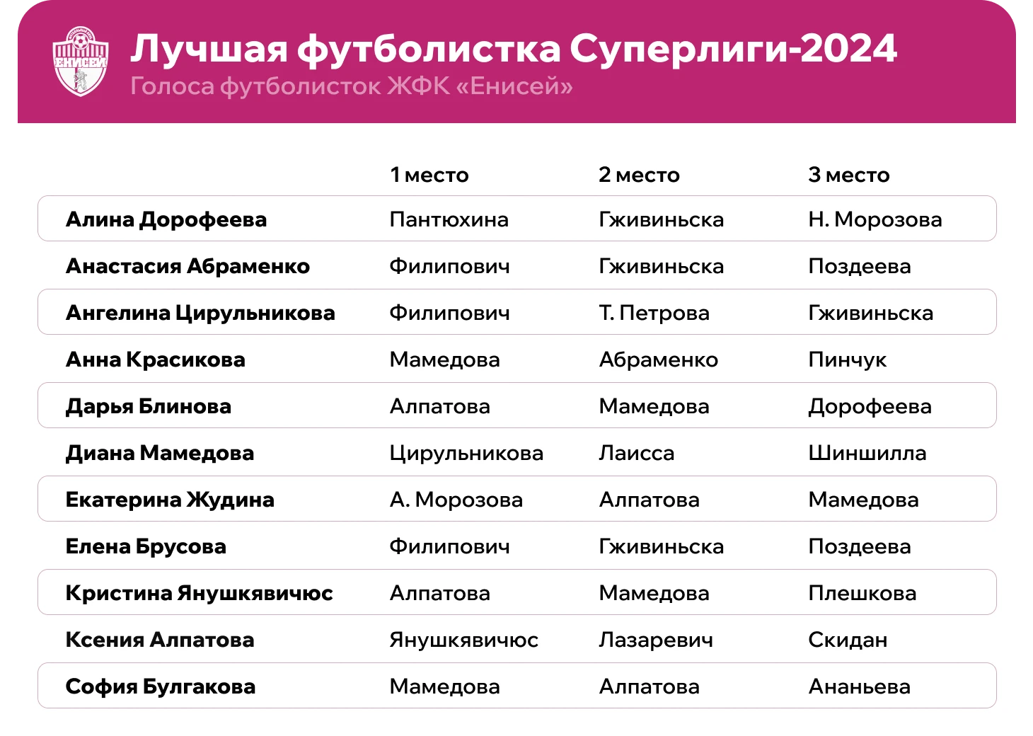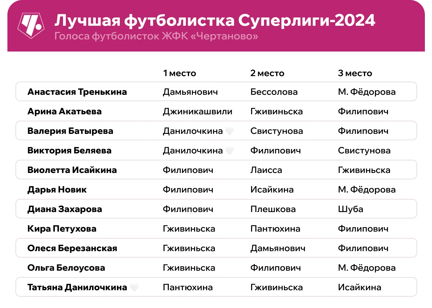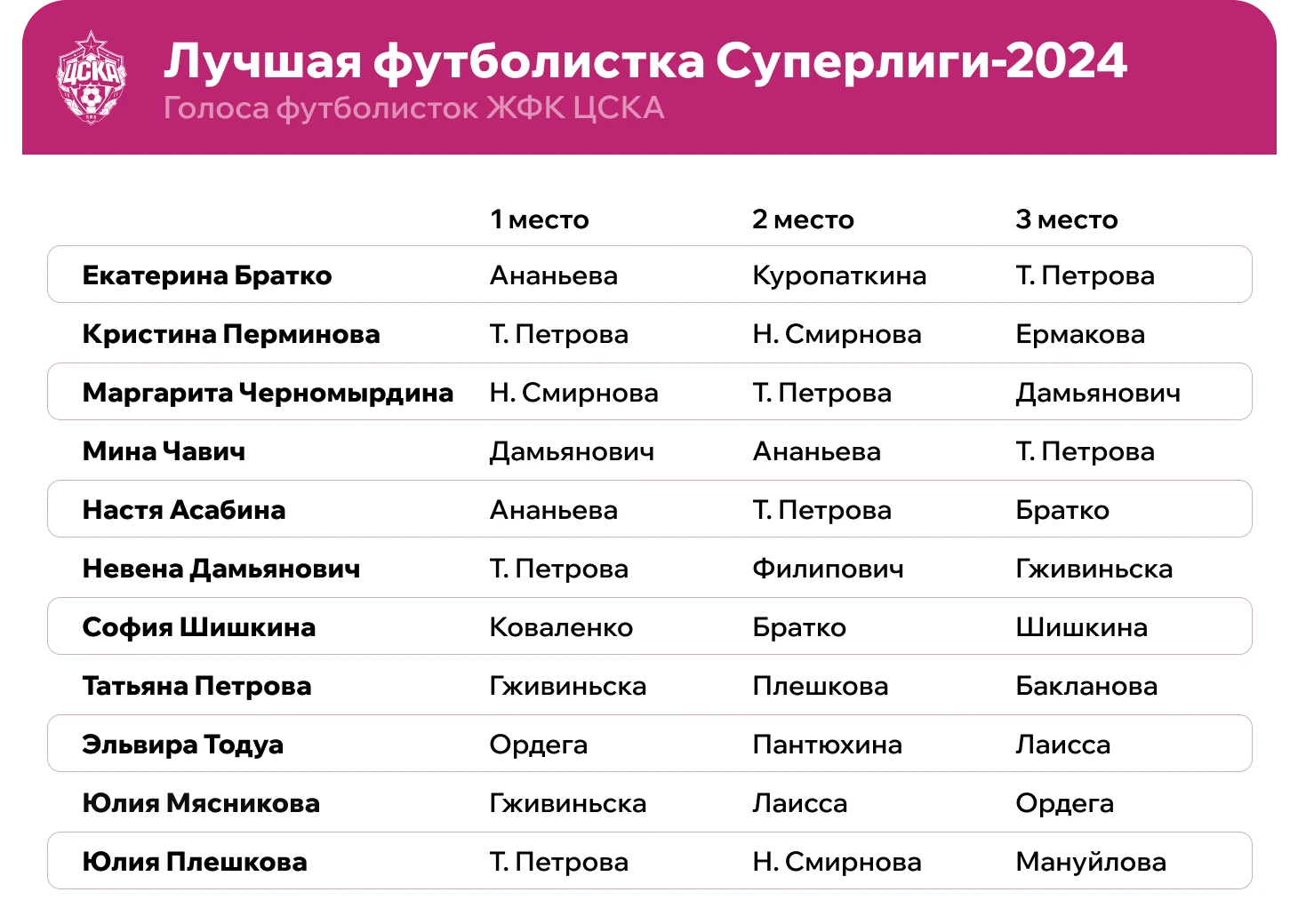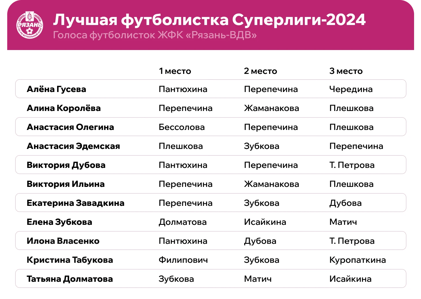 Лидерами голосования внутри многих команд стали местные игроки: Габриэла Гживиньска в «Зените», Арина Шуба в «Краснодаре», Марина Федорова в «Спартаке».
