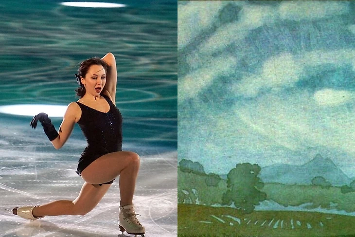 Как вы видите, свои акварели он дополнял стихотворными надписями. Только к одному из коллажей я сама подобрала стихотворение поэта - «Альбомы стали нынче редки». Я решила рискнуть, сделав коллаж на фото трёх фигуристок, трёх подруг, на акварель, которую М.Волошин не сопроводил своими поэтическими строками.