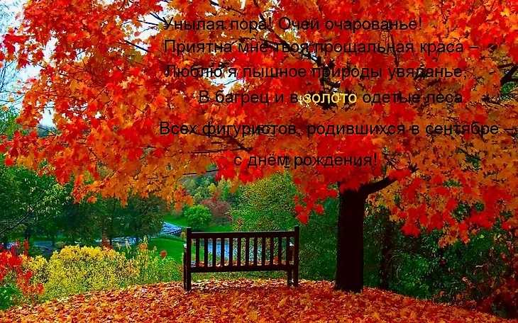 Данный пост посвящён фигуристам, родившимся в сентябре, в прекрасную пору «Золотой осени» и «Бабьего лета». На память сразу приходят Пушкинские строки: «Унылая пора! Очей очарованье! Приятна мне твоя прощальная краса – люблю я пышное природы увяданье, в багрец и в золото одетые леса…»