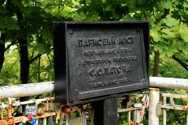Этот мост был построен, чтобы добраться до нижних склонов Днепра с Крещатика. У него есть еще и другие названия: Чертов мост, Мост самоубийц, Малый мост Патона, Мост влюблённых. Последнее название было присвоено ему в связи с тем, что время от времени здесь создаются влюбленные союзы, часто можно увидеть целующихся молодых людей, пары, крепко держащиеся за руку, много счастливых глаз.
