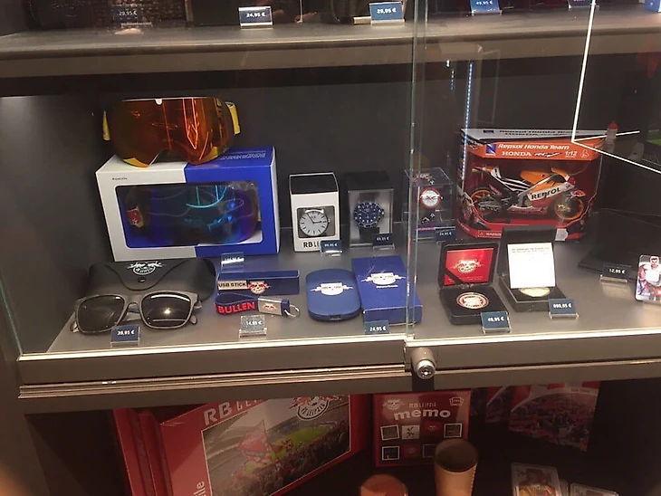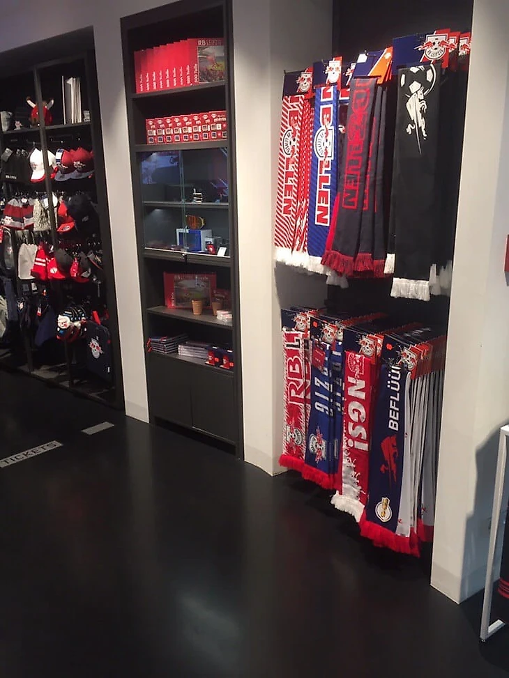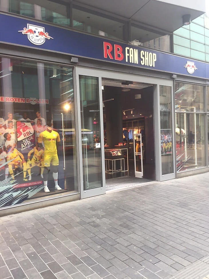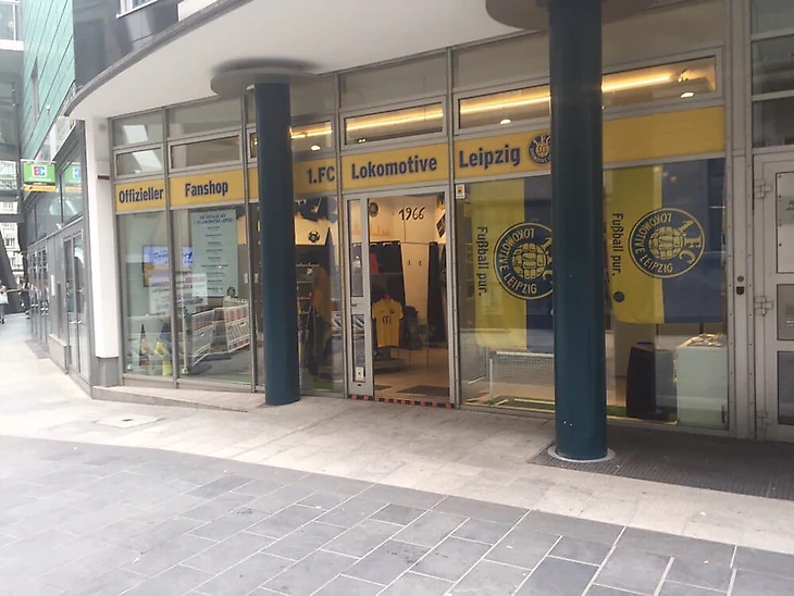 Если чуть свернуть с площади и пойти в сторону старой ратуши, то вы попадете на улицу Петерштрассе. Тут находятся сразу два фан-шопа: «RasenBallsport Leipzig» и чуть поодаль от него «Локомотив». Магазин «РБ» лично меня не впечатлил, но для поклонников клуба он вполне подойдет. Набор атрибутики в виде шарфов, игровых футболок и флагов присутствует. Можно даже выпить прохладный энергетик. Для всего остального (брендированные очки от Ray-Ban, флешки, наручные часы и тд ) есть Мастеркард (с).