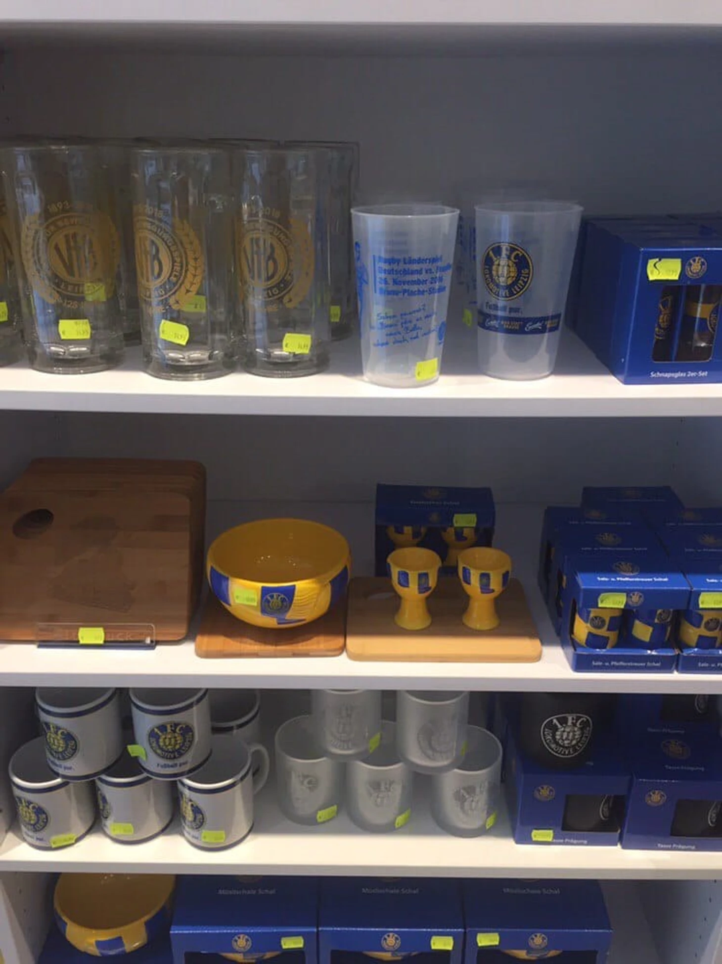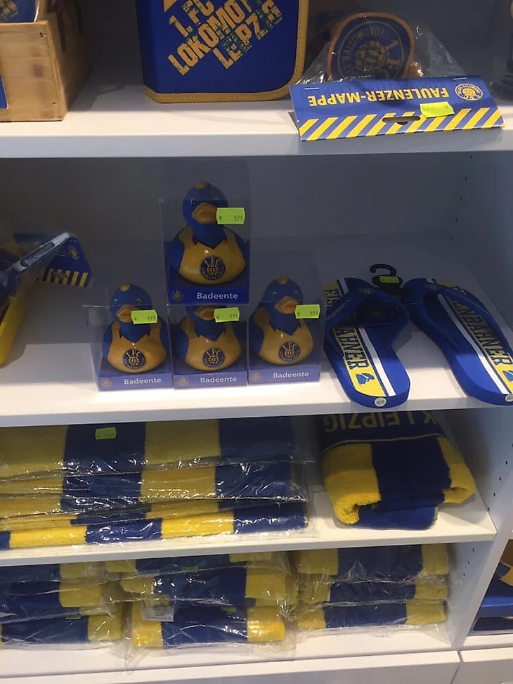 Ассортимент в магазине «Лок» интереснее. Тут и модные панамы, железные значки (те самые pins), принадлежности для дома, уточки для ванной, пивные и чайные кружки, фанзины. Широко используется логотип VFB Leipzig, как отражение преемственности поколений. Цены достойные, единственный минус – отсутствие возможности оплатить картой. Возможно это уже пофиксили, но в 2019 году мне пришлось идти до соседнего банкомата за углом и снимать наличные. Кстати, это распространенная тема для малого бизнеса в Германии, чтобы не платить лишние проценты по операции.