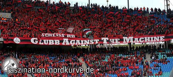 На очевидной аллюзии на название американской группы Rage Against The Machine подробно останавливаться не стоит. Отмечу лишь то, что тут обыгрывается борьба традиций против корпорации (традиционный клуб «Нюрнберг» против корпоративного монстра «РБ»).