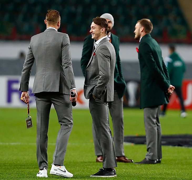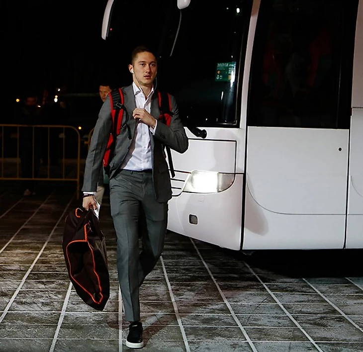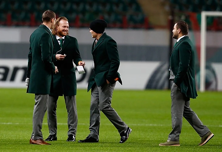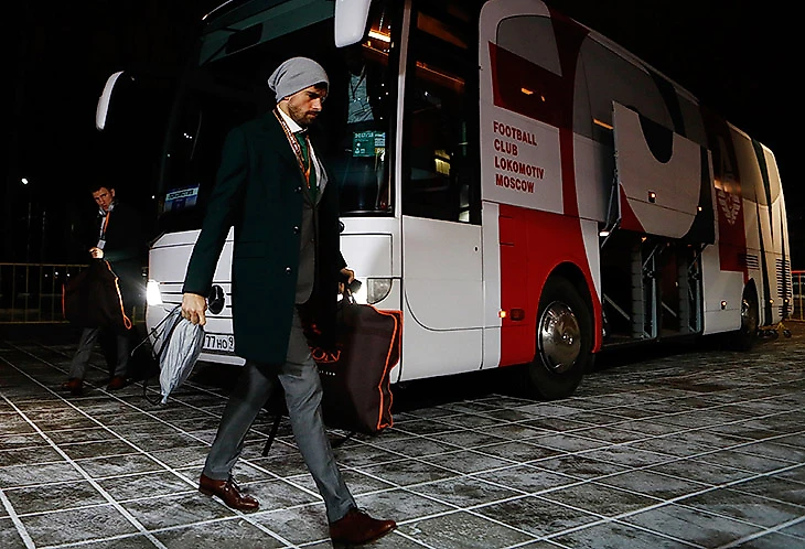 На матч против «Копенгагена» московский клуб прибыл в серых приталенных костюмах и пальто глубокого зеленого оттенка.