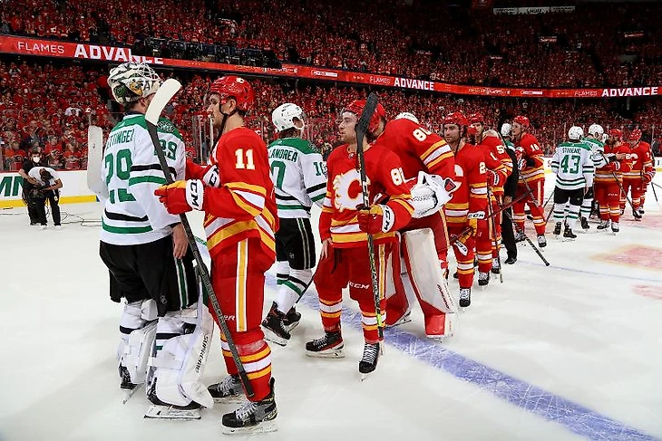 Даллас отправляется в отпуск, а Калгари во второй раунд плей-офф, где их ждет БИТВА при провинции АЛЬБЕРТА. Эдмонтон Ойлерз, взявшие верх (также в семи матчах) в противостоянии с Лос-Анджелес Кингз, станут следующим соперником команды Дэррила Саттера в Кубке Стэнли.