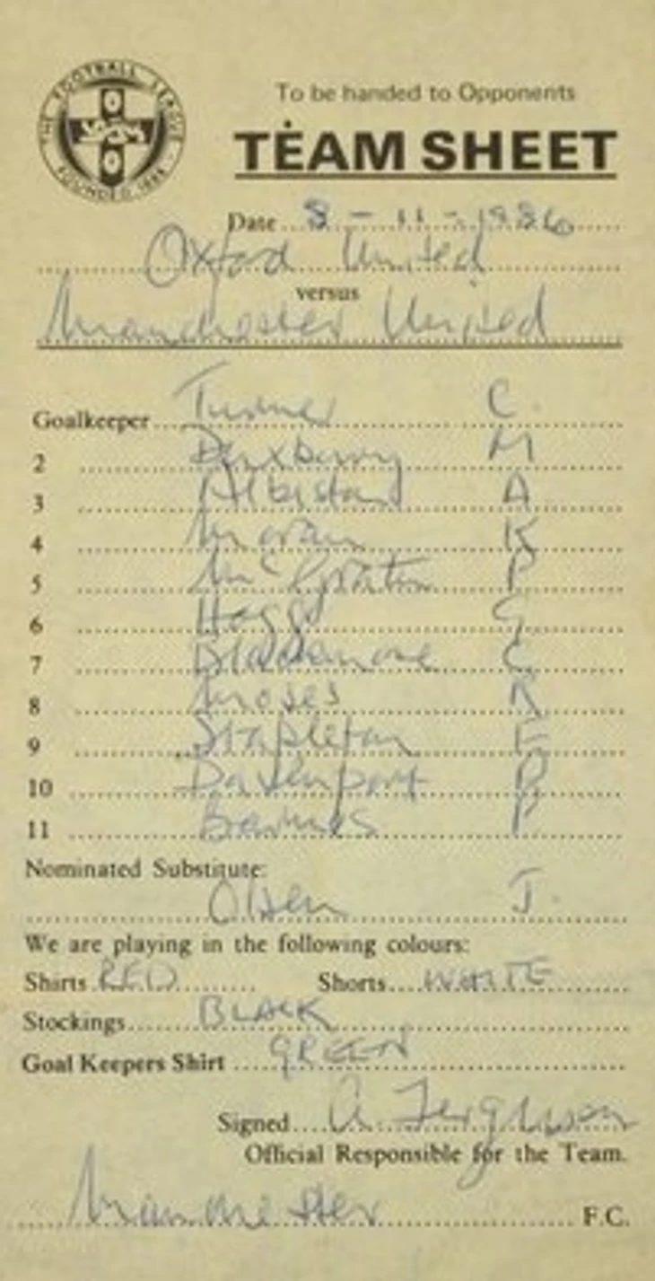 Этот листок был продан на аукционе в июне 2013 года за £ 19 000. Неплохо для обрывка бумаги, на котором Ферги перечислил состав своей команды на дебютный матч: Крис Тернер, Майк Даксбери, Артур Альбистон, Кевин Моран, Пол МакГрат, Грэм Хогг, Клейтон Блэкмор, Реми Мозес, Фрэнк Стэплтон, Питер Дэвенпорт, Питер Барнс с одним запасным – Джеспером Олсеном.