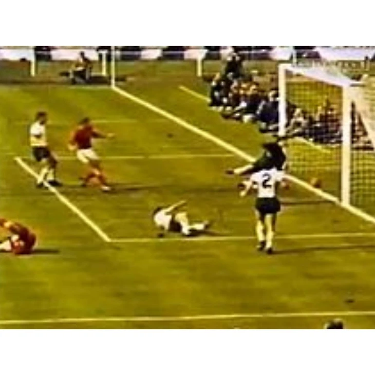 Обменявшись голами в начале матча, команды продолжили его в яростном атакующем ключе. Голкиперы Бэнкс и Тилковски были вынуждены раз за разом спасать свои команды. На 78-й минуте Мартин Питерс наконец пробил немецкого вратаря, но англичане не смогли удержать победный счёт, пропустив на 89-й минуте гол от Вольфганга Вебера. В овертайме Англия продолжила штурмовать соперника, и это привело ко второму мячу Джеффа Хёрста, ставшему одновременно одним из самых спорных и вечно обсуждаемых эпизодов мирового футбола. Хёрст попал в перекладину, мяч от неё отскочил вниз, а затем вылетел в поле. Швейцарский арбитр Готфрид Динстспросил бросил взгляд на линейного судью из СССР Тофика Бахрамова, был ли гол, а тот взмахом флажка уверенно указал на центр поля.