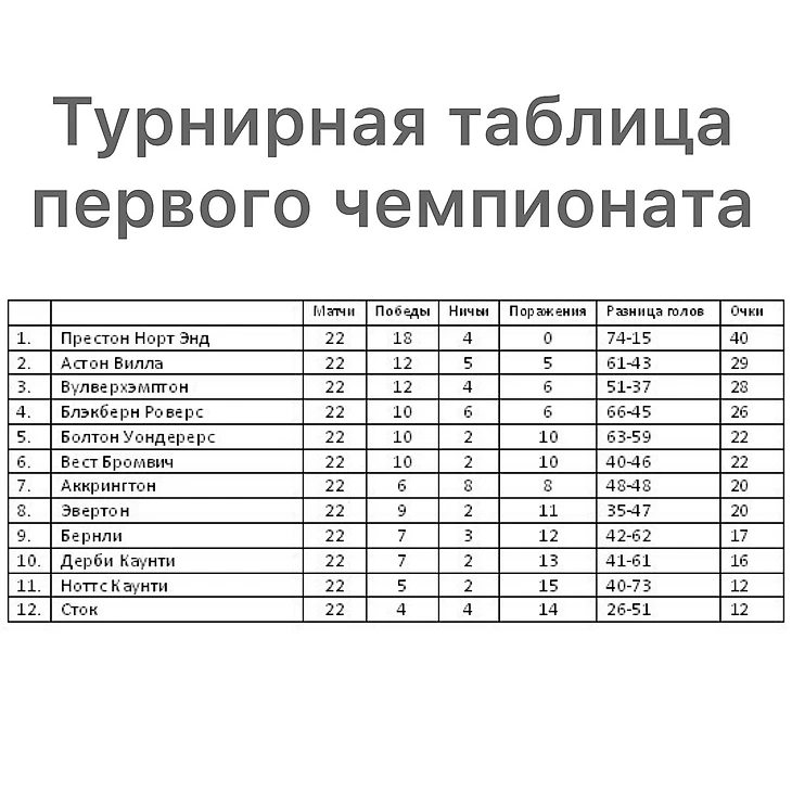 В итоге, такие клубы, как «Аккрингтон», «Астон Вилла», «Блэкберн Роверс», «Болтон Уондерерс», «Бёрнли», «Дерби Каунти», «Эвертон», «Ноттс Каунти», «Престон Норт Энд», «Сток», «Вест Бромвич Альбион» и «Вулверхэмптон» собрались вместе, чтобы сформировать Футбольную лигу – первую национальную лигу в мире.