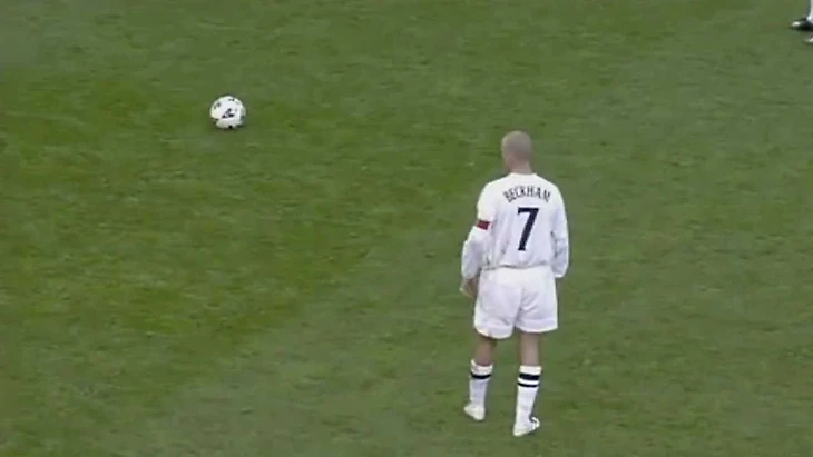 Итак, суббота, 6 октября 2001 года. Квалификационный матч к чемпионату мира 2002 года. В Манчестере Англия проигрывает Греции на «Олд Траффорд» со счётом 1:2. На третьей добавленной минуте судья назначает штрафной в сторону ворот наследников Эллады. Бекхэм устанавливает мяч и готовится к удару. Десять минут назад он уже бил с похожей позиции и промазал. Концентрация, разбег, удар и … смотрим видео.