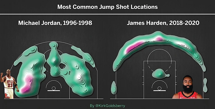 Вот так выглядит диаграмма активности Джордана. Вот так выглядит диаграмма современного баскетбола.