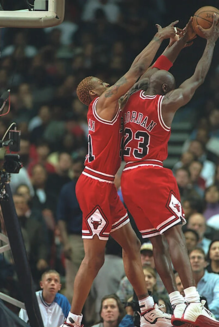 Джордан девять раз включался в символическую защитную пятерку лиги и на протяжении 90-х был частью команды, год за годом входящей в элиту по защите (в 96-м году при мотивированном Родмане они были лучшими в НБА). И приучил к тому, что атакующая нагрузка не мешает ему на своей половине, что он лучший по формальным защитным показателям, что он хорош и в беге с препятствиями за Реджи Миллером, и в пихании с каким-нибудь двухметровым Дрекслером, а также в подстраховке. И в том, что если его разозлить, то он вместе с мячом вынет еще и душу.