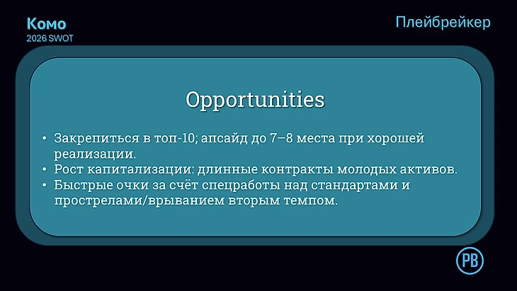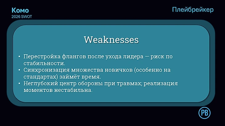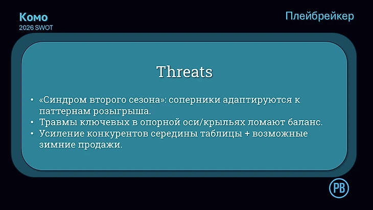 Реалистичный потолок — «подмять» зону 8–10 места и подпрыгнуть к 7–8 при стечении обстоятельств (здоровье лидеров + реализация). Полка рисков - синдром второго сезона» и адаптация молодых вингеров. Минимум - уверенная середина таблицы, без нервной весны.