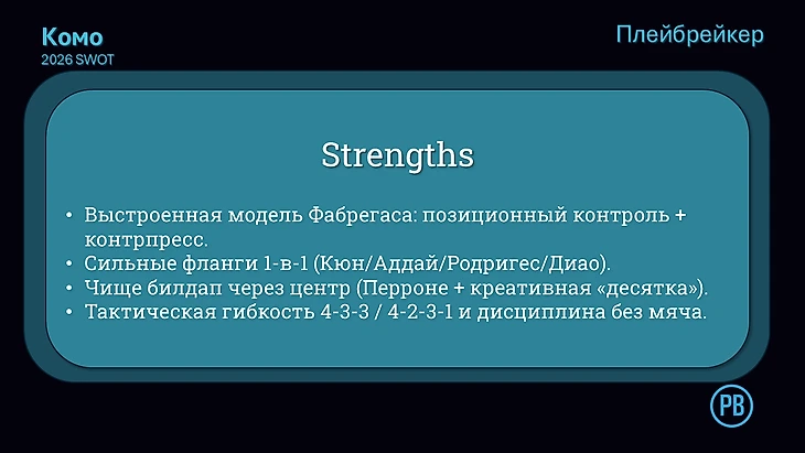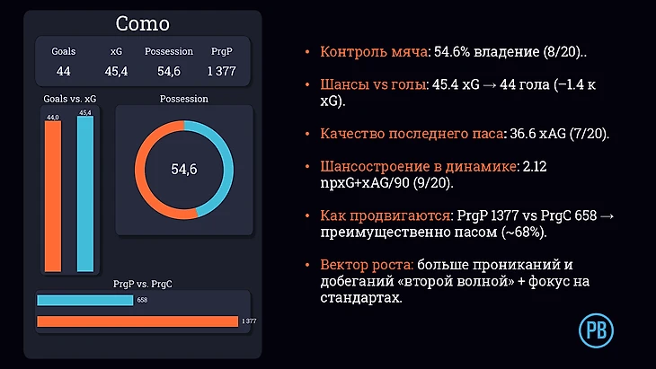 За счёт организованного давления «Комо» держал соперников на низком качестве моментов: в материалах Wyscout/Hudl клуб прямо хвалили за то, как команда «гасит» чужие удары до штрафной. Не «автобус», а наработанные триггеры прессинга и плотность в центре.