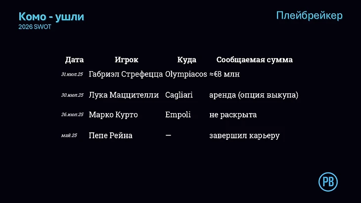 Габриэл Стрефецца — один из лиц подъёма, но летом-2025 продан в «Олимпиакос»: клуб переформатирует крыло под новую скорость и возраст.