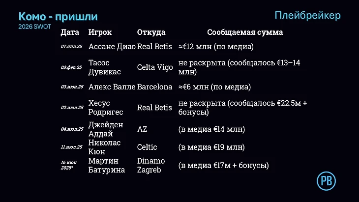Постоянные контракты Перроне и Валле уже закрыты; клуб подтянул молодые «крылья» — Джейден Аддай (AZ) и Хесус Родригес (Бетис) на долгие сроки, делая ставку на скорость и 1v1.