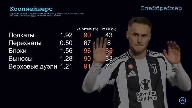 Партнёр рядом: рядом - «пылесос» (Тюрам/Локателли в «агро-режиме»), который закроет метровые коридоры при потерях, чтобы не «жечь» Коопмейнерса в обороне.