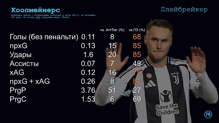 Командные контексты: при Тудоре «Юве» вернулся к более прямолинейной, но всё равно контролирующей версии 3-4-2-1/3-4-3 с широченными коридорами для вингбеков/вингеров. В такой рамке ценятся левоногие «шестёрки/восьмёрки», которые могут менять сторону атаки одной передачей и обслуживать гибридную «девятку» (Давид/Влахович/Опенда) и инсайдов (Йылдыз/Консейсау/Жегрова). Коопмейнерс - один из немногих в ростере с таким набором.