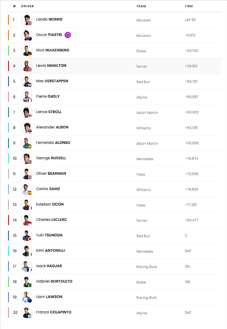 Лучший круг гонки забирает Пиастри — 1:29:337, который, очевидно, не рад, что его не поменяли позициями с Ландо.